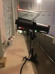 アーク灯:高電圧をかけたプラスマイナス2本の銅の棒を接近させてスパークさせる、”接続させる小さい雷”のようなもの。この強烈な光量を使用しているので、操作はとても難しい。